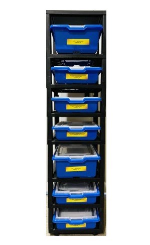 Выполнена в виде конструкции из пластмассы с роликовыми колесами и имеет форму полочного стеллажа. Количество уровней стеллажа соответствует количеству комплектов.