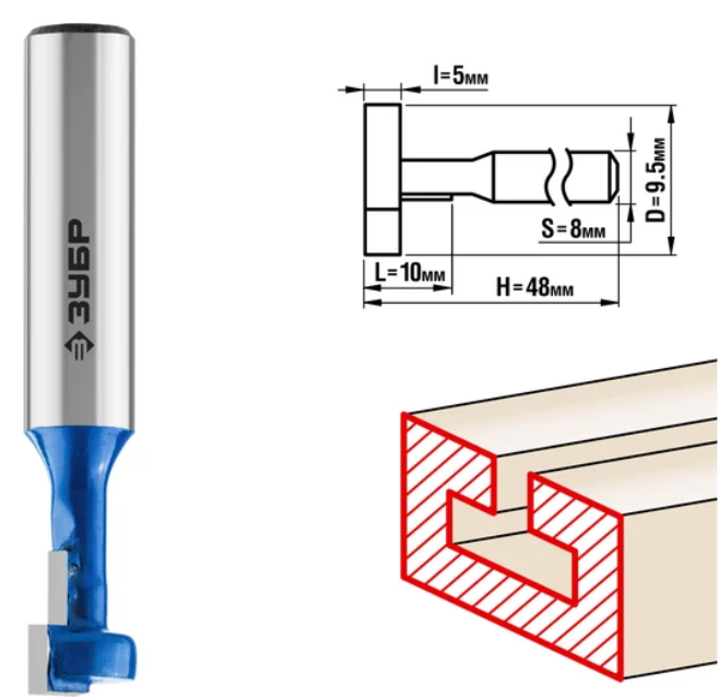 Пазовая Т-образная фреза ЗУБР Профессионал (модель 28749-9.5-48) – высококачественный инструмент для профессиональной деревообработки. Эта фреза идеально подходит для создания Т-образных соединений, выборки пазов на кромках и торцах деталей, а также для использования при работе по шаблонам.