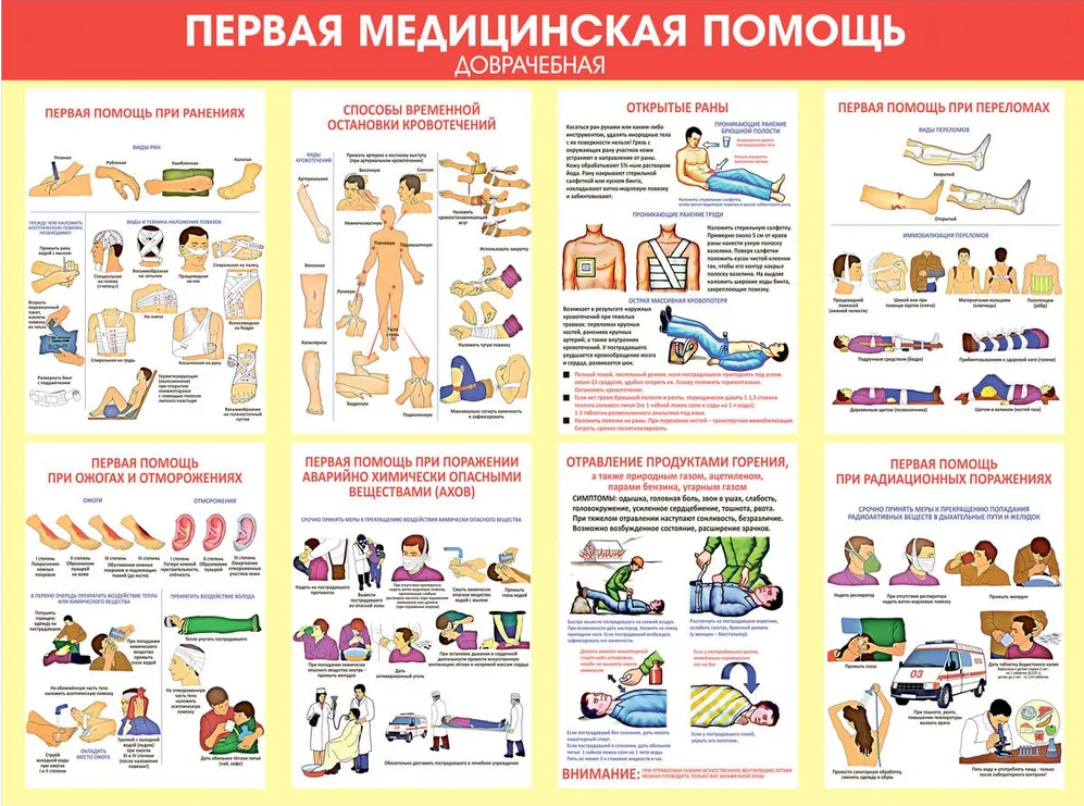 На плакате схематически изображены алгоритмы оказания первой медицинской доврачебной помощи: при ранениях, ожогах и отморожениях, способы временной остановки кровотечений, помощи при поражении аварийно-химически опасными веществами, открытых ранах, при отравлении продуктами горения, переломах и при радиационных поражениях.