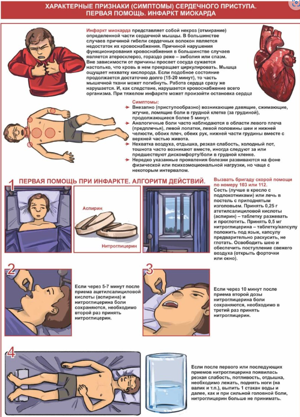 Плакат «Первая помощь при инфаркте» используется при обучении оказания первой помощи, а также помогает на местах, в случае возникновения ситуации, при которой необходимо принять неотложные меры по спасению человека.