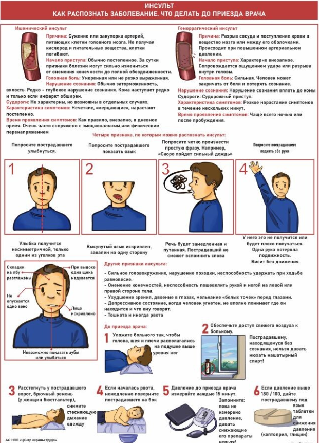 На плакате отражены правильные меры по обеспечению поддержки пострадавшего до прибытия врача, в том числе описаны характеристики инсульта и его признаков у человека.