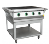 Корпус плиты выполнен - лицевая и верхняя части из нержавеющей стали, остальные части из стали оцинкованной. Плита оснащена четырьмя чугунными конфорками общей площадью 0,48 м2., размер каждой 417х295 мм., мощность одной конфорки 3 кВт., максимальная температура рабочей поверхности не более 480 градусов, три ступени регулировки мощности конфорок.Плита оснащается регулируемыми по высоте ножками. Поставляется в собранном виде на поддоне. Упаковка гофрокартон.