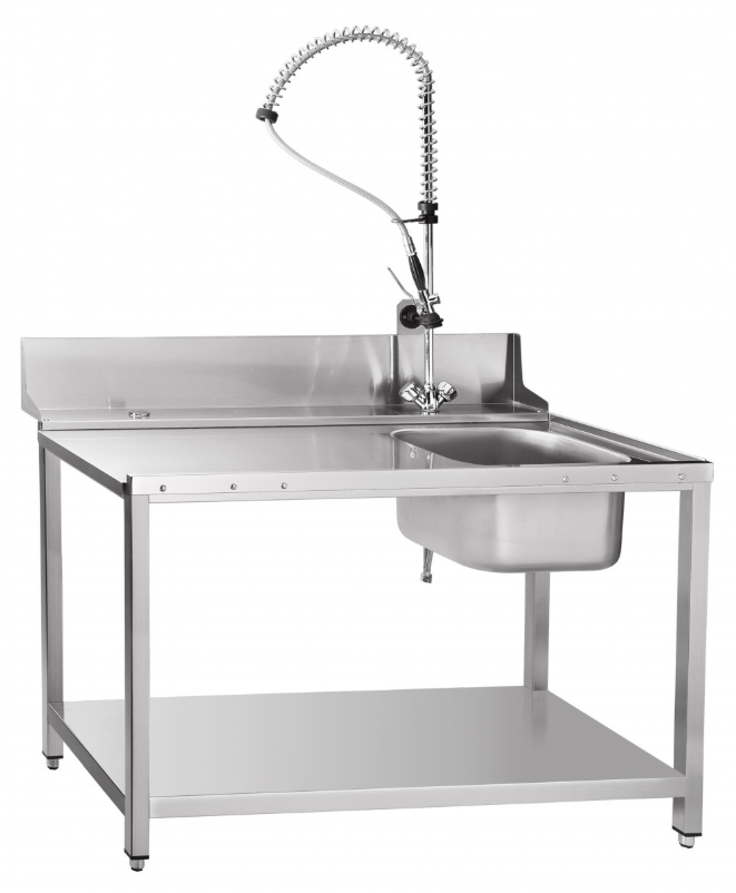 цельнотянутая ванна для предварительного ополаскивания посуды; душ для мойки посуды; полка; выполнен полностью из нержавеющей стали; возможность установки как в левом так и в правом исполнении; регулируемые по высоте ножки