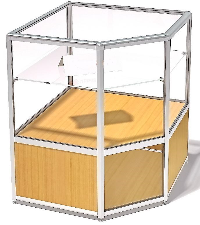 Прилавок демонстрационный угловой аквариум. Профиль - по каталогу RAL или анодированный,заполнение - ДСП ламинированная (цвет - по выбору). Габариты 700х700х900 мм