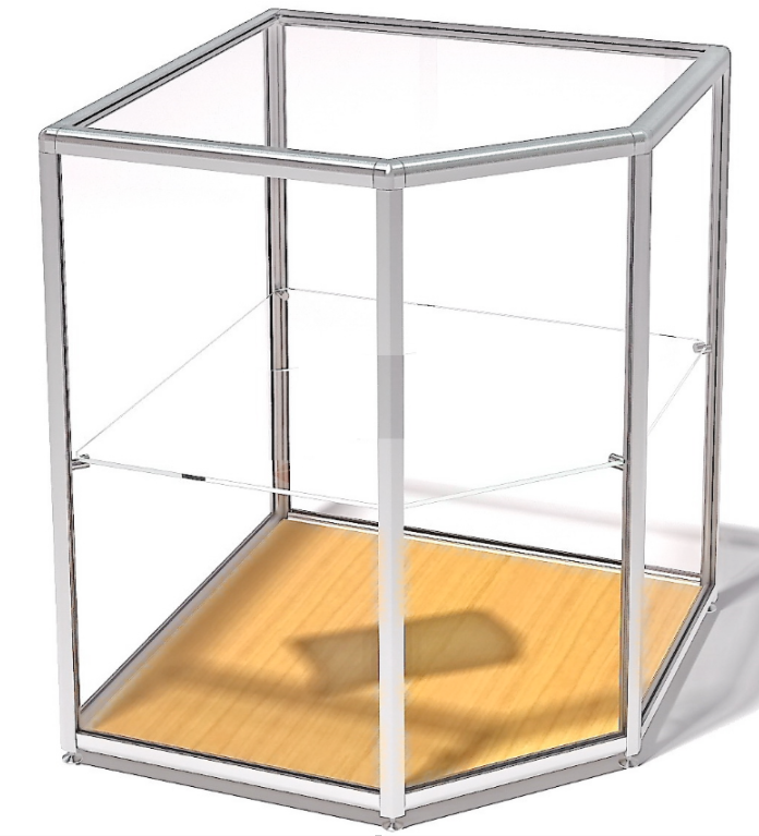 Прилавок демонстрационный угловой аквариум. Профиль - по каталогу RAL или анодированный, заполнение - ДСП ламинированная (цвет - по выбору). Габариты 700х700х900 мм