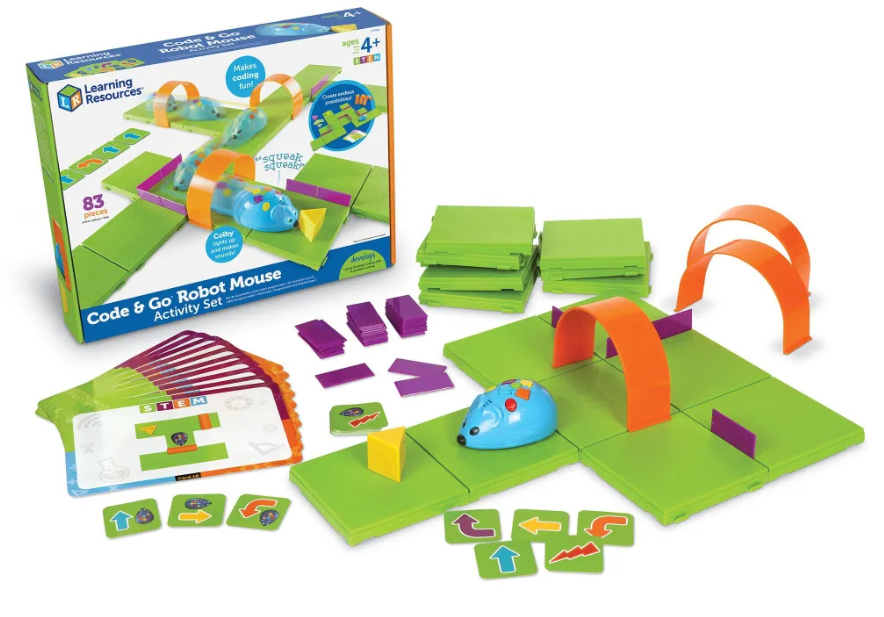Набор состоит из 30 двухсторонних карточек для программирования, которые позволяют ребенку создавать свои собственные алгоритмы и программы, следуя указаниям и инструкциям на карточках. Также в комплект входят 16 пластиковых поля и 22 пластиковых стены для создания собственных лабиринтов, 3 арочных элемента для создания туннелей, 10 карт с заданиями и 1 мышь-робот.