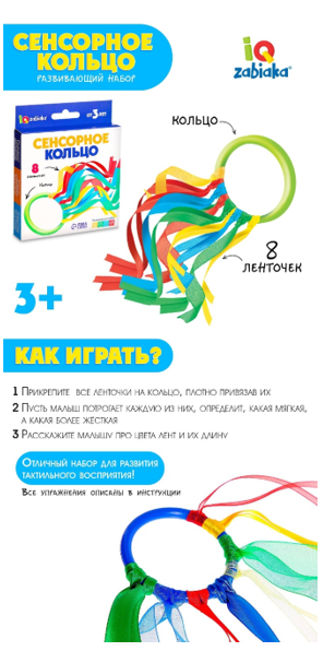 Развивающий набор «Сенсорное кольцо» предназначен для развития мелкой моторики и тактильного восприятия. С его помощью ребёнок пополнит словарный запас, познакомится с понятиями «гладкий», «шершавый», «длинный», «короткий», «узкий», «широкий» и научится сравнивать предметы между собой по разным признакам.