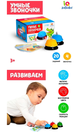 Развивающий набор станет любимой игрушкой вашего ребёнка. В нём малыш обнаружит 4 цветных звонких колокольчика. Они помогут ему запомнить цвета, цифры, научиться считать и решать много полезных заданий с карточек!