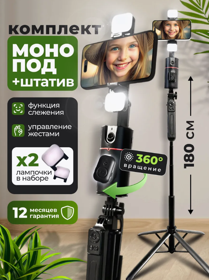 Штатив для телефона+ Монопод с слежением и фонариками
