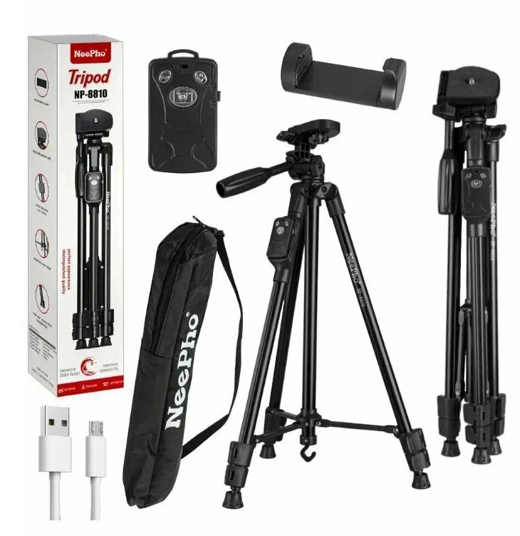 -Кабель micro USB, 19 см -1 шт; -Bluetooth пульт -1 шт; -Держатель телефона DT-8810 6 до 8,5 см -1 шт; -Напольный штатив, трипод NP-8810 light -1 шт; -Штативная площадка PL-8810 для трипода - 1 шт; -Сумка для переноски трипода NP-8810 -1 шт.