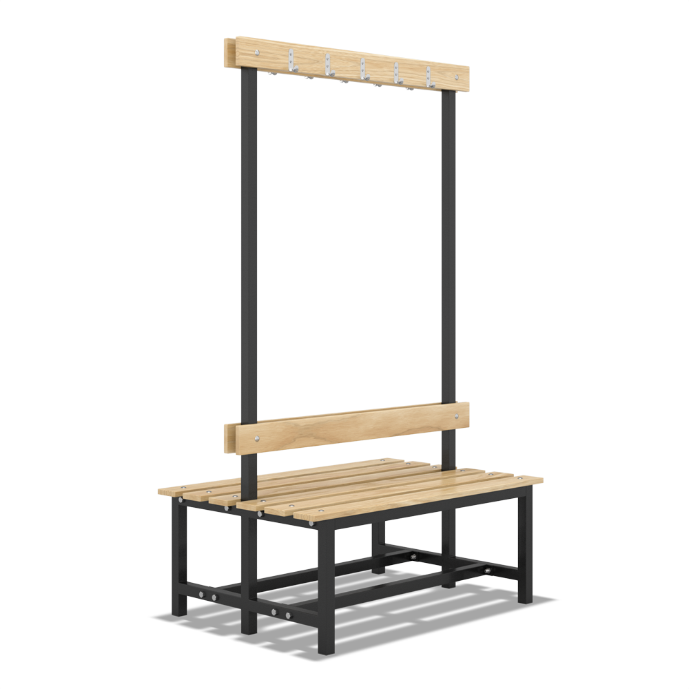 Скамья с вешалкой двухсторонняя предназначена для переодевания и хранения одежды. Может быть использована для раздевалок спортивных комплексов. Эргономичный современный дизайн. Оптимальное использование внутреннего пространства помещений. Скамья с вешалкой состоит из 2-ух металлических стоек, окрашенных с помощью полимерной краски в электростатическом поле, является разборной. Сиденья выполнены из деревянных реек с влагостойким покрытием экологически чистым лаком.