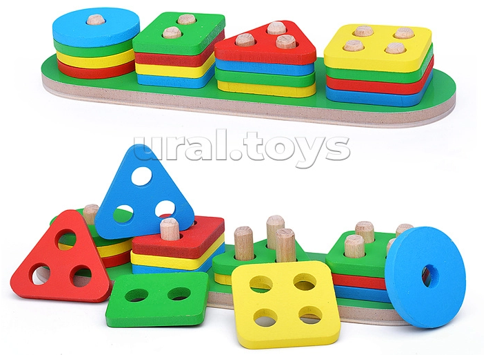 - 16 деревянных деталей (5 см.) с отверстиями (4-х форм, 4-х цветов).