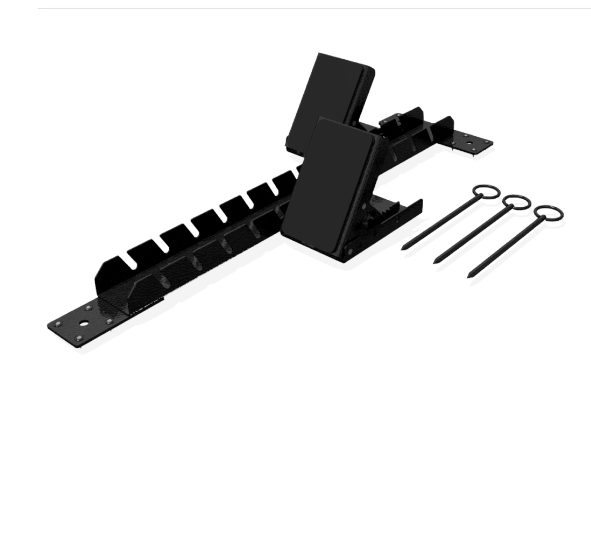 Изготовлены из стали. Основание - блок с 12 пазами для фиксации левой и правой колодок.(длина 760мм, ширина 60мм, шаг деления 50мм). Блок с 12ю съемными шипами для синтетического трека. Колодки регулируются по углу наклона 5 положений и имеют резиновые накладки. Размер колодки 160х105мм. В комплект входит 3 якорных гвоздя для крепления к грунту. Вся конструкция покрыта порошковой эмалью.