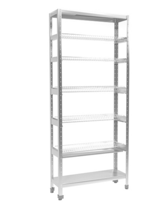 Каркас из уголка оцинкованной стали. Полки сетка стальная хромированная. Под нижней полкой установлен поддон для сбора жидкости из нержавеющей стали.