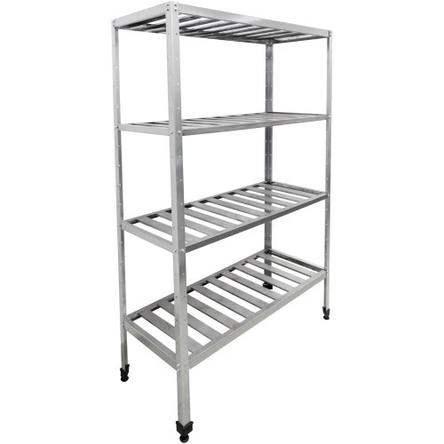 Полки рештки из нержавеющей марки стали AISI 430. Стойки стеллажа из оцинкованного уголка, имеют крепежные отверстия для установки полок на любой необходимой высоте. Стеллаж имеет регулируемые по высоте ножки. Изделие поставляется в разобранном виде. Упаковка гофрокартон.