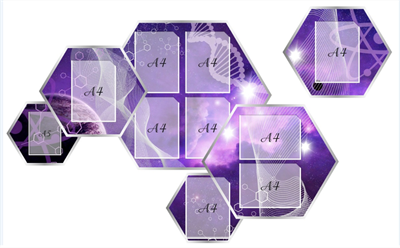 Стенд фигурный комплект (шестиугольник с одним прозрачным карманом А4 1,67х1,12 м; Вторая часть состоит из 5-ти шестиугольных стендов с карманами А4 (2 горизонтальных, 6 вертикальных) и А5) 1670х1120. общий размер 1950х1200 мм