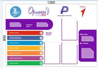 Стенд Орлята России Движение первых фиолетовый с цветными карманами размер 1300 х 900 пластик 3 мм с карманами А4-3шт.