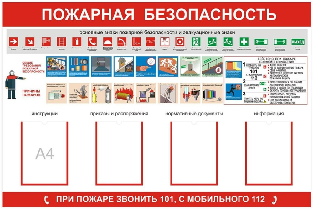 Стенд Пожарная безопасность с карманами А4 количество 4 шт вертикальные, размер 1200х1000 пластик 3 мм