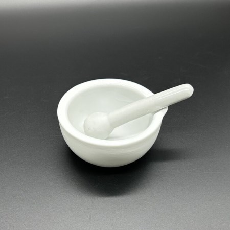 Ступка 100 мм с пестиком применяется в лабораториях для измельчения твердых веществ и для тщательного перемешивания веществ пестиком.