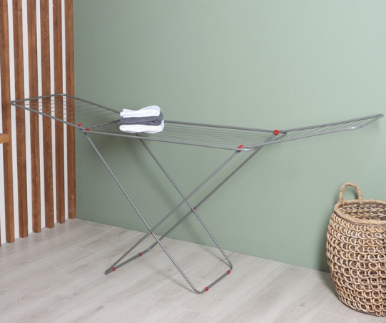 Компактная и устойчивая сушилка с полноценными боковыми «крыльями» выполненными из трубы 12 мм. Удобный и надежный механизм раскладывания. Пластиковые колпаки на ножках сушилки защищают пол от царапин. Все углы сушилки плавно скруглены.