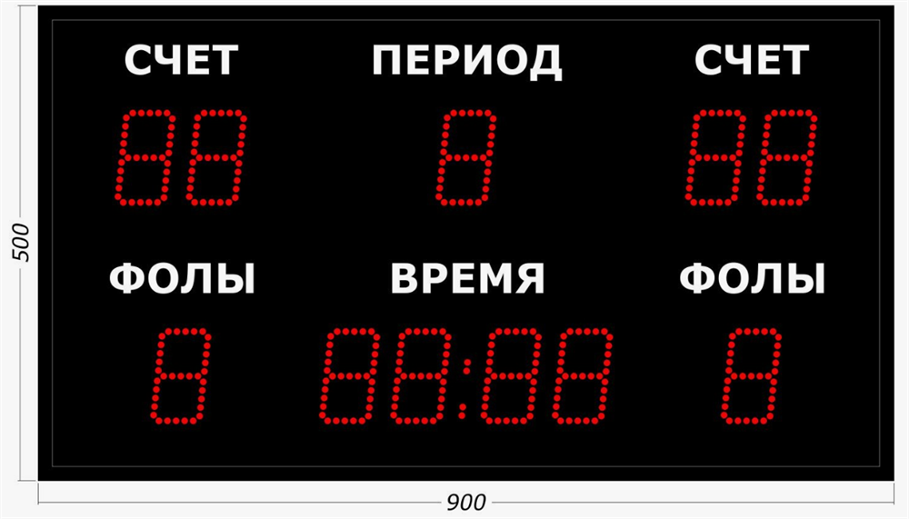 Отображаемые параметры: Счет для 2-х команд, формат [88]. Время игровое или астрономическое ( в неигровом режиме), формат [88:88]. Период, формат [8]. Командные фолы для 2-x команд, формат [8].