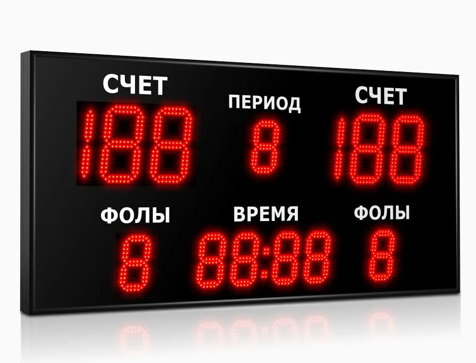 Отображаемые параметры: Счет для 2-х команд, формат [88]. Время игровое или астрономическое (в неигровом режиме), формат [88:88]. Период, формат [8]. Командные фолы для 2-x команд, формат [8].