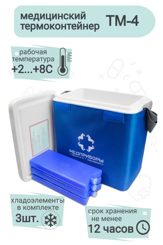 Термоконтейнер ТМ4 (3,5 литра) синий — это компактное и надёжное устройство для транспортировки и временного хранения биологических материалов и лекарственных препаратов. Предназначен для поддержания стабильного температурного режима в диапазоне от +2 до +8 °C. Используется для перевозки донорской крови, эритроцитной массы, вакцин, кровезаменителей и других медицинских препаратов, требующих холодового хранения.