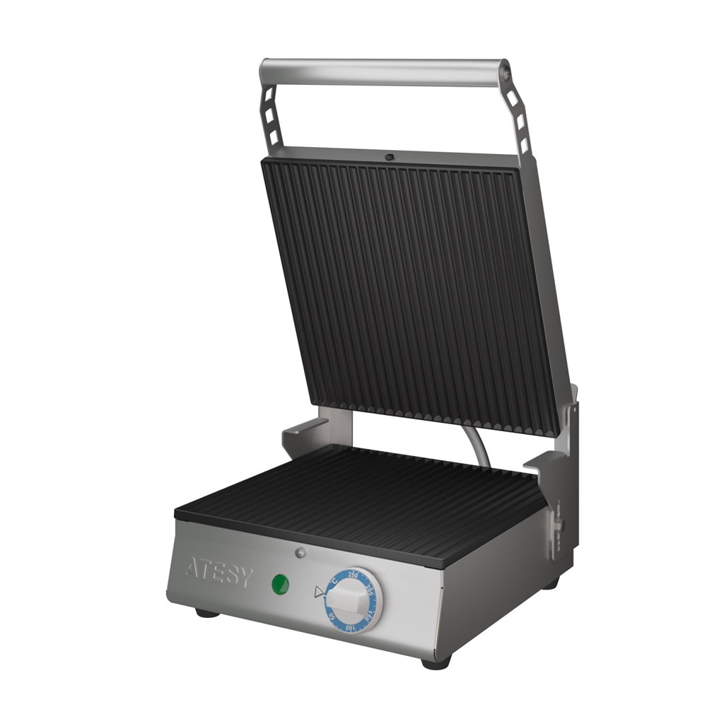 Контактный гриль ATESY Престо ТГК-1-1.6- У-Ч-Р используется на предприятиях общественного питания и торговли для быстрого разогрева всех видов хлеба, сэндвичей, хлеба с колбасой, хот-догов, булочек с бургерами, сэндвичей, французских тостов, панини и аналогичных видов готовых незамороженных продуктов. Модель оснащена электромеханической панелью управления с плавной регулировкой температуры жарочных поверхностей. Корпус гриля выполнен из пищевой нержавеющей стали AISI430.