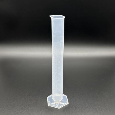 На боковой стороне цилиндра нанесена шкала объема с ценой деления 1 мл. Первая отметка шкалы - 10 мл.