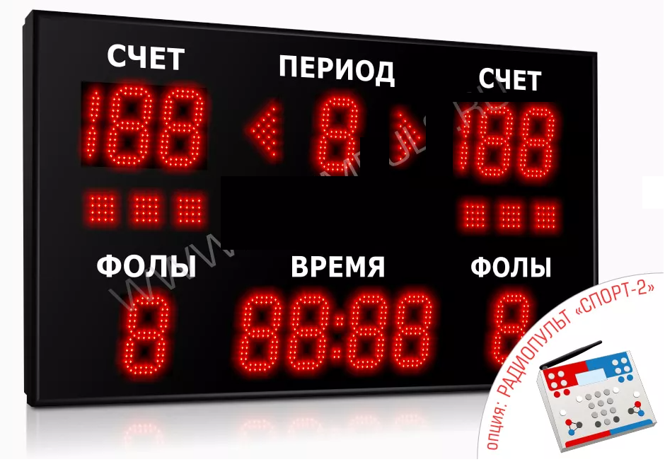 Оно отображает текущий счет для обеих команд, номер периода, игровое время, командные фолы, количество затребованных тайм-аутов, направление владения мячом. Высота цифровых индикаторов 130 мм.