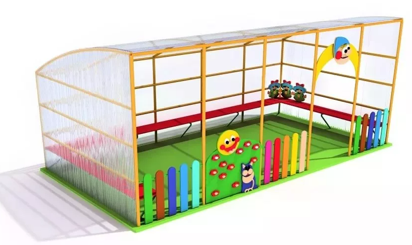 Каркас изготовлен из металла, крыша и стены из поликарбоната, заборчик из влагостойкой фанеры. Пол выполнен из доски камерной сушки. Установлены лавочки по периметру и декоративные элементы.