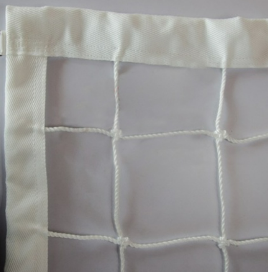 ВОЛЕЙБОЛЬНАЯ СЕТКА Д 2,6 ММ (ОБШИТАЯ С 1-ОЙ СТОРОНЫ + 3 СТОРОНЫ ОВЕРЛОК), ПАРАШЮТНАЯ СТРОПА 50 ММ, БЕЛАЯ