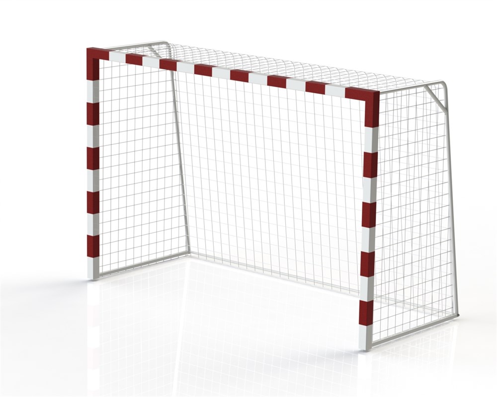 Передние стойки и штанга выполнены из металлической профильной трубы 80х80х3 mm, что соответствует международным требованиям. Разметка согласно стандартам IHF с использованием самоклеющейся плёнки.