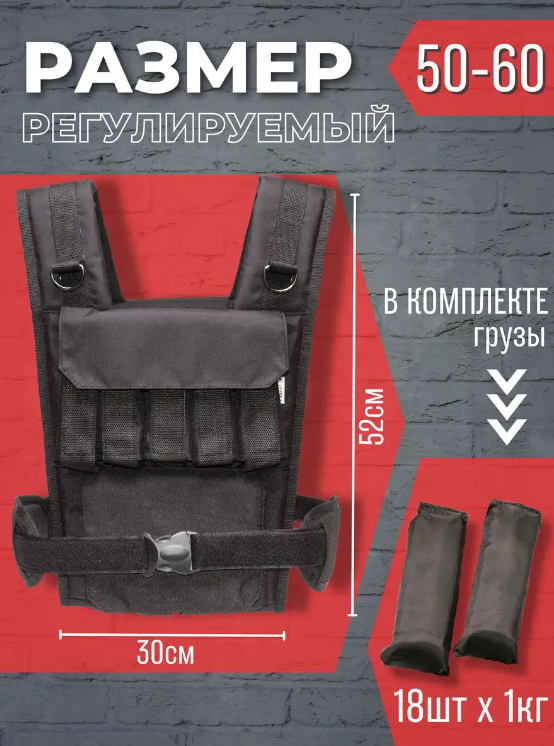 Спереди и сзади расположены в 2 ряда кармашки всего 18 штук для грузов по 1 кг в каждом, это позволяет равномерно распределять нагрузку на тело при тренировках, оставляя руки свободными. Жилет можно регулярно стирать в стиральной машине при температуре 30. Размер регулируется с 50 до 60. Вес 18 кг.